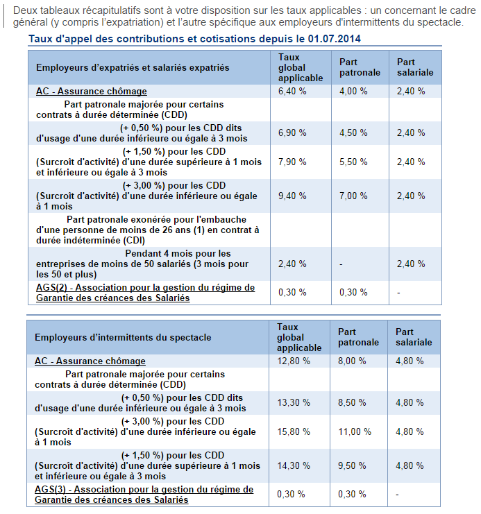 Précisons au passage, parce que cela nous concerne, que pour les intermittents, le taux de cotisation est de 13.3% soit plus du double de celui annoncé (ce lien); précisons également que les CDD font également l’objet de cotisations supplémentaires pouvant représenter une hausse de près de 50% : l’unicité du taux de cotisation affichée par l’Unédic (voir sur le communiqué de presse les fondamentaux de l’assurance chômage ne changent pas) n’existe pas, on ne résiste pas à donner le tableau des taux applicables; on notera l’énigmatique mention « employeurs d’expatriés et salariés expatriés » qui semble le seul moyen de qualifier le « cadre général » rappelé en préambule du document.