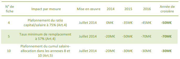 La mesure 5 abaisse le taux minimum de remplacement du régime général : économie de 70M€ ; la mesure 4 introduit un plafonnement du ratio capital/salaire: gain 50M€ : il s’agit ensemble de 3.3% du déficit.