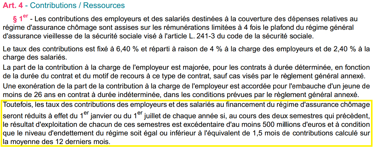 Toujours est-il que la modification du taux de cotisation, si elle n’est pas évoquée à la hausse, est déjà prévue à la baisse dans la convention d’assurance chômage : dans son article 4 paragraphe 1er , le taux est précisé révisable à la baisse tous les six mois, en fonction des résultats des 12 mois précédents.