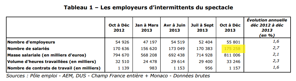 Pôle-Emploi fournit bien un décompte régulier du nombre de salariés relevant des annexes 8 et 10 : mais il s’agit d’un décompte trimestriel sur lequel il est impossible d’additionner les chiffres de chaque trimestre. On ne peut donc y lire qu’un minimum de 175.000 salariés (page 1 du document PDF, colonne Oct-Dec 2013).